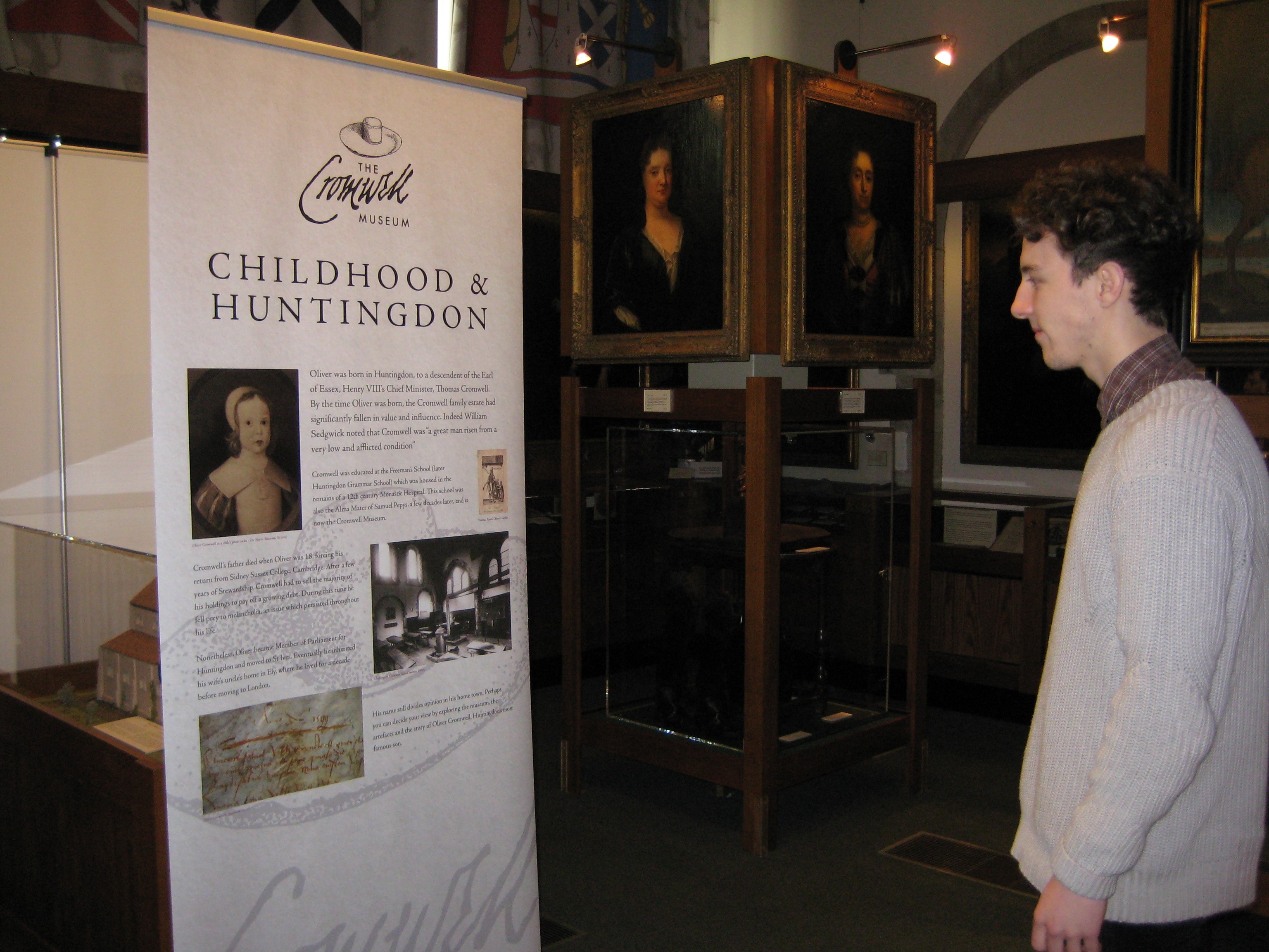 In April 2016 management of the Cromwell Museum transferred from the County Council to the Cromwell Museum Trust. During preparations for the transfer it was difficult for the Museum to sustain its education and outreach programmes, so a grant was awarded to facilitate loans from other museums, such as an exhibition from Epping Forest and objects from the Norris Museum in St Ives. The latter was doubly useful as the Norris closed in the summer of 2015 in preparation for a major HLF-funded redevelopment. The photo shows a temporary exhibition using the Museum’s new logo.