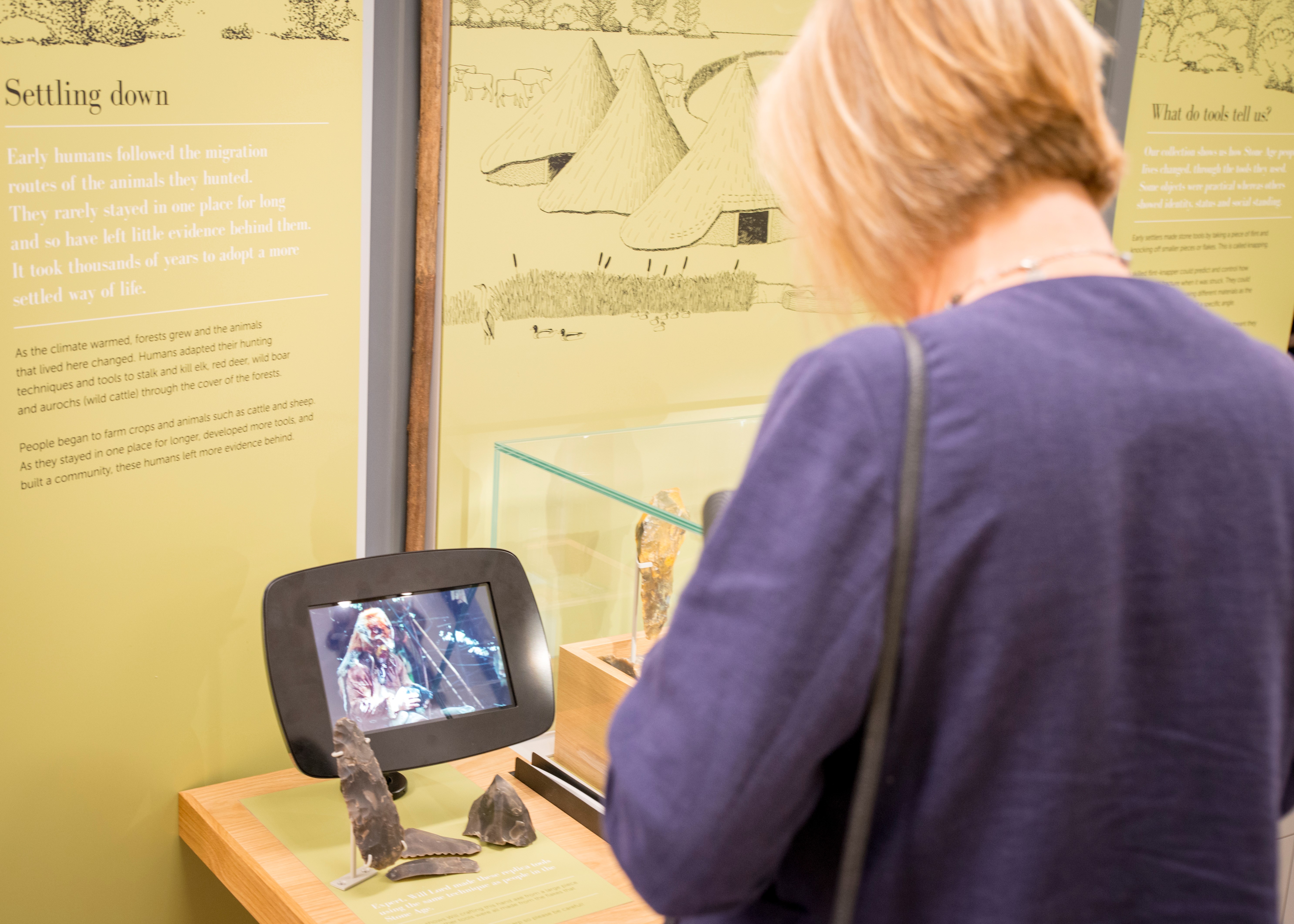 As part of the Museum’s superb HLF-funded redevelopment completed in July 2017, the grant allowed the production of a film about the manufacture of Stone Age implements. The film, which is integral to the displays about ancient Huntingdonshire (see photo) was made with Will Lord. Will is a specialist replica maker, who is shown making flint tools in the film, wearing ‘Prehistoric’ clothing including a cloak made of a fox hide.