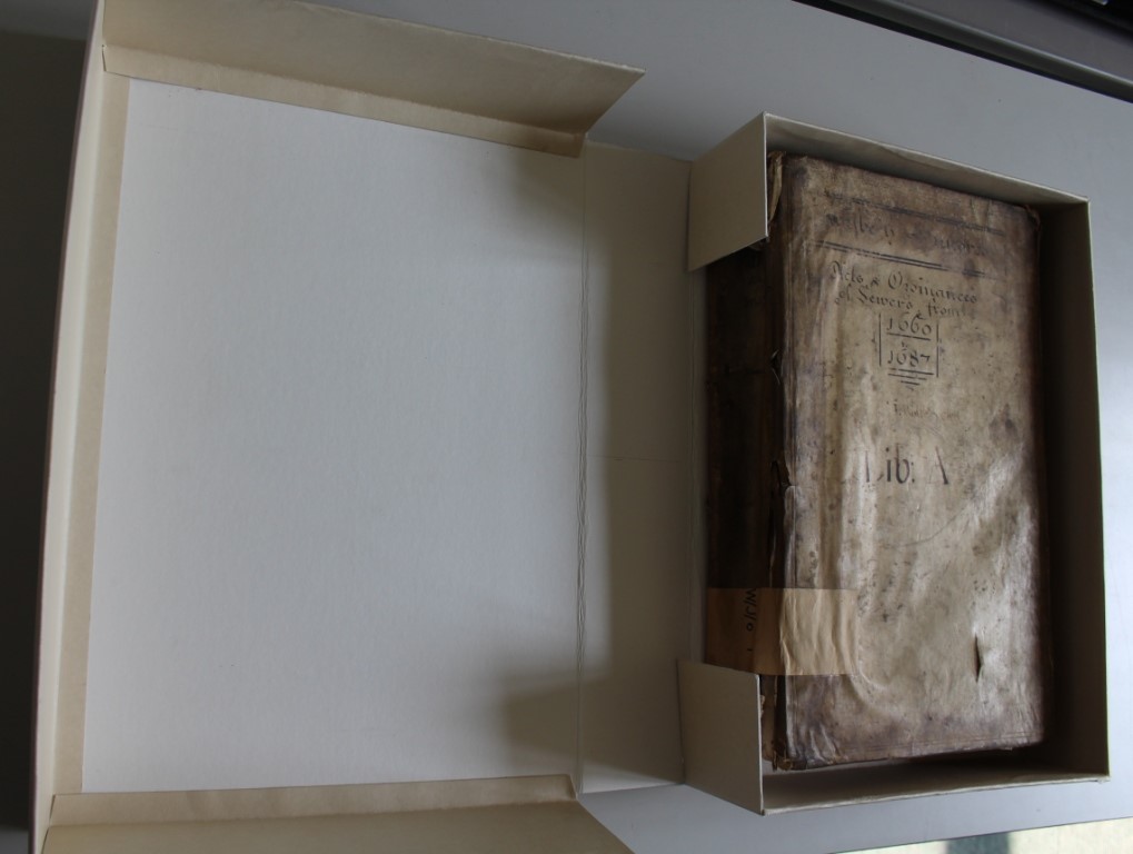 The grant was used to purchase a range of conservation supplies, as recommended in Deborah Walton’s conservation audit in April 2016. As part of an inventory of parts of the collection, designed to improve storage conditions, the museum acquired materials to make custom archival storage boxes (the photo shows a volume of Court of Sewers records from 1660-1687 being re-stored in a custom clam shell box). The grant also covered the costs of new pest traps and Econospace spacers for use with glazing for pictures.