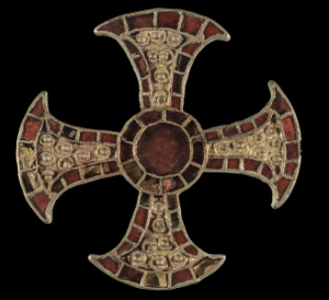 2. Trumpington Cross, Museum of Archaeology and Anthropology- The cross was found on a teenage girl alongside a set of gold and garnet pins and on what was once a beautifully carved wooden bed. Bed burials like this are extremely rare, as are pectoral crosses – there are only five other examples of pectoral crosses, and none of them were sewn directly onto the clothing like this was. As the majority of Anglo-Saxon bed burials are for young women and include valuable grave goods it is thought that they were wealthy and high status; perhaps serving as abbesses as they tended to come from noble families. Not only a stunning portrayal of craftsmanship in the early middle ages, it is also special because it marks this young woman out as one of the earliest converts to Christianity at the time. It also illustrates the breadth of trade and religious connections of the community.
